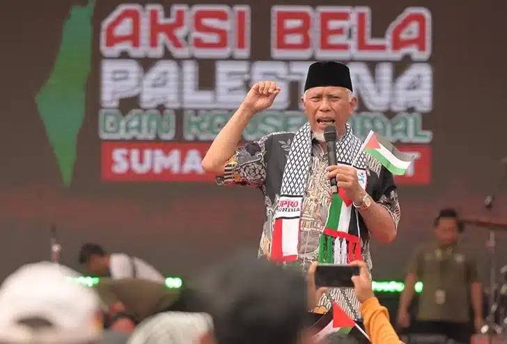 Karena itu, kami pesankan kepada Presiden Republik Indonesia, Bapak Prabowo Subianto, agar sepenuh hati mendukung perjuangan Palestina hingga benar-benar merdeka, ujar Mahyeldi disambut pekikan takbir ribuan peserta.